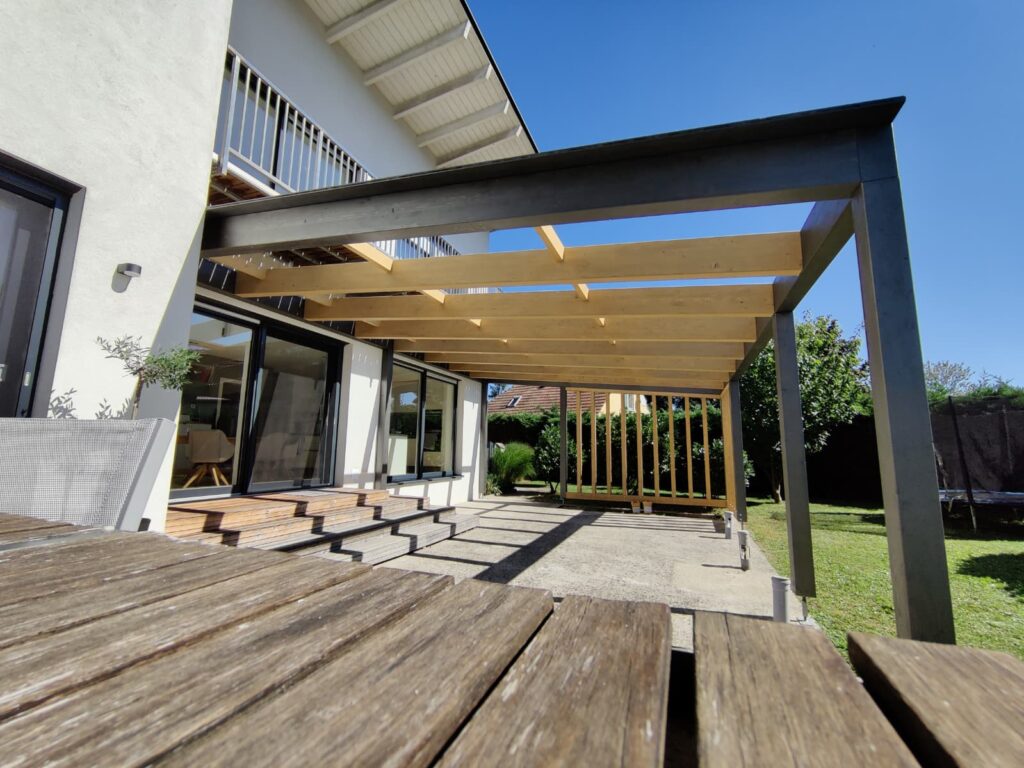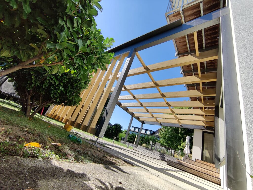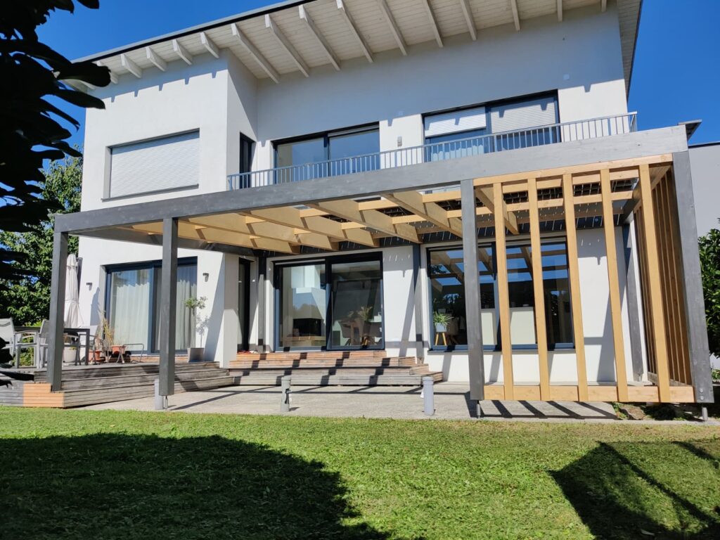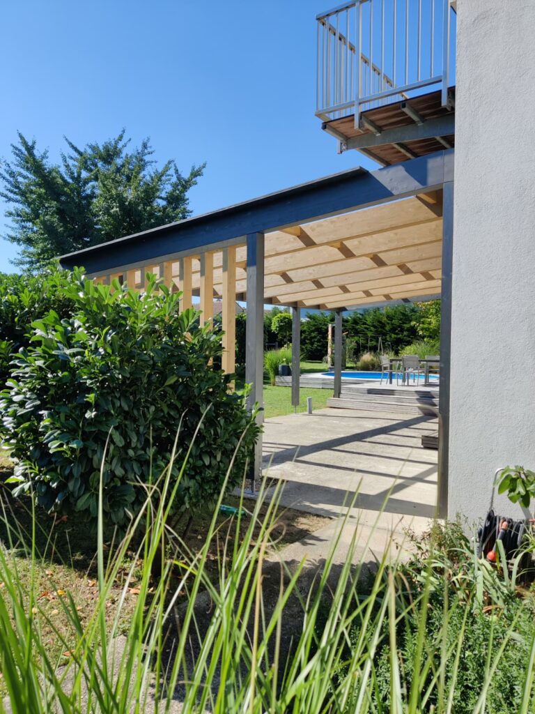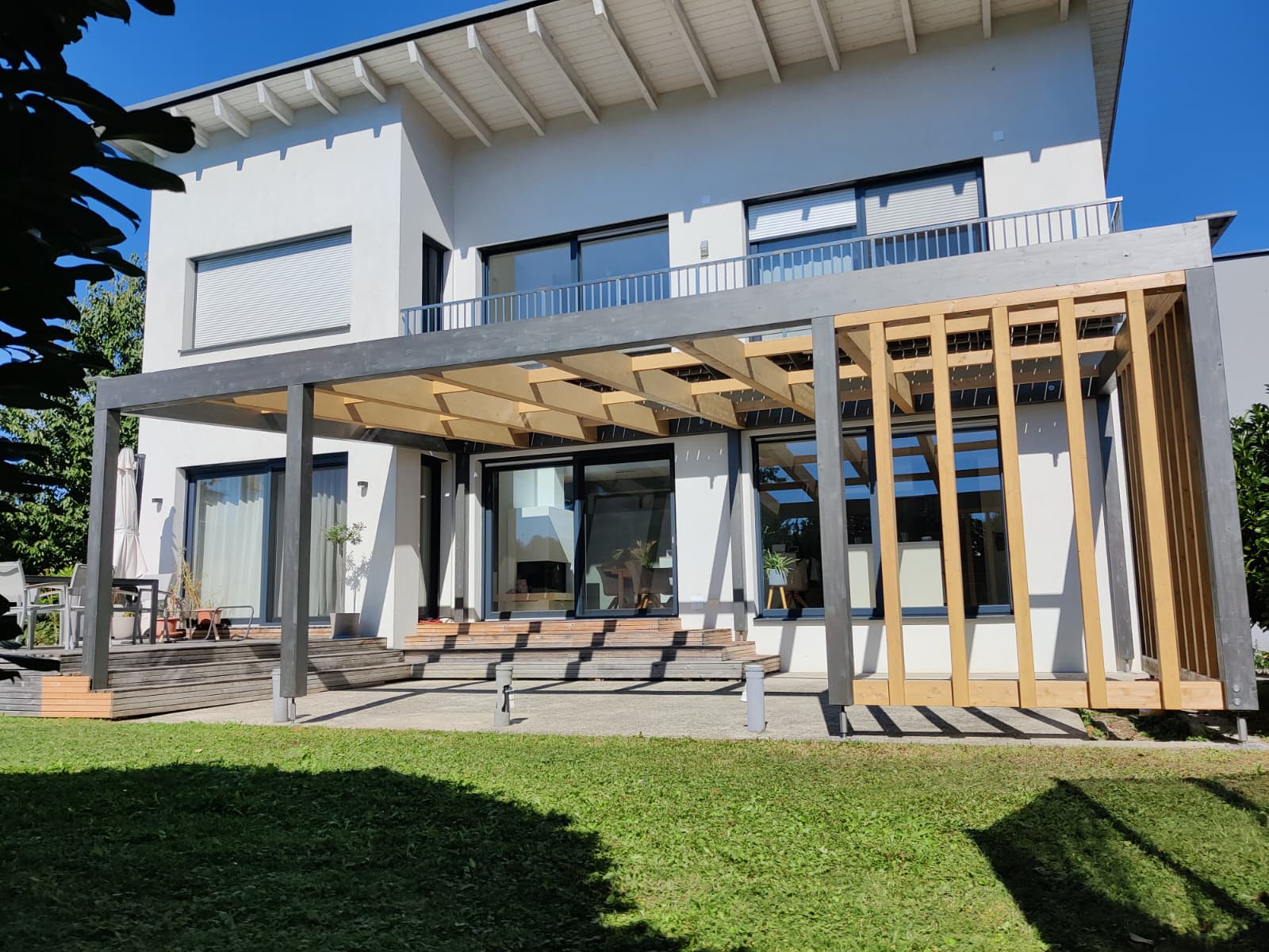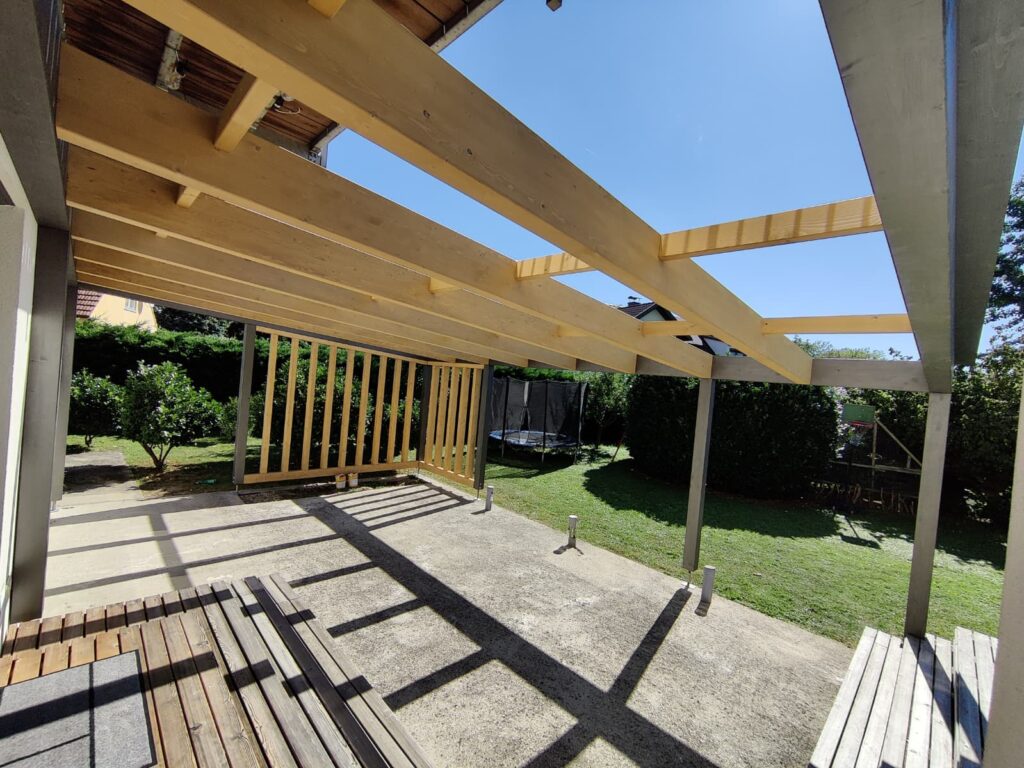 Diese Pergola wurde von uns in Böheimkirchen errichtet. Die Terrassenüberdachung hat eine Grundfläche von 8,5 x 6 Meter und wurde aus Fichtenholz gefertigt. Die Dachkonstruktion wurde so geteilt, dass PV Module darauf platziert werden können. Mit der zweifärbigen Lackierung ist die Überdachung ein echter Blickfang.
